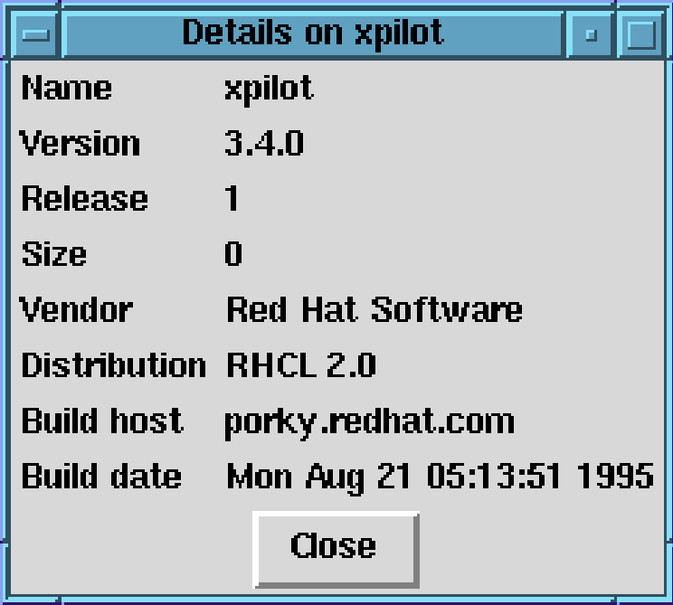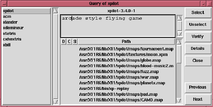 The name, version, and release of the current package are in the top middle of the query window. Immediately below this is the description of the package, which can be quite large. A scroll bar is there to let you read the whole thing.