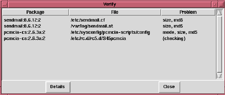 Choosing the packages to verify is the same as choosing the packages to query. Select the packages and use the Verify button or choose the Verify entry from a context sensitive menu. A window opens like the one in figure 48.