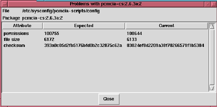 The three columns in this window describe the package with a problem in it, the file that has the problem, and a brief description of the discrepancies that were found. While the check is running, the current file being checked appears as the last element in the list, and the problem is listed as (checking). A full list of the problems that can be found through verification appears in figure 49.