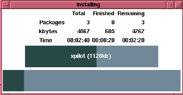 After you've begun the installation, a window appears like the one in figure 52. It tracks the progress of the installation so you'll know something is happening. The top bar shows how much of the current package (whose name is listed inside of it) has been installed while the bottom graph shows how much of the total installation has been finished. The number of packages, package sizes, and time estimates are continually updated.