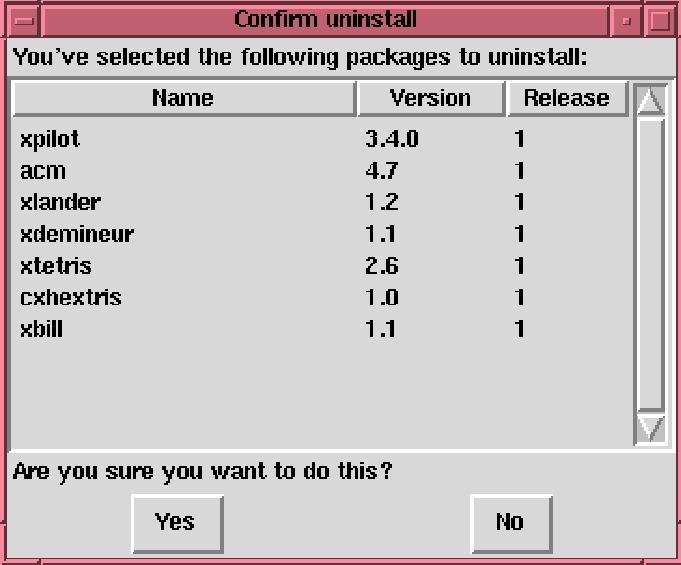 Once you've begun the uninstall, glint asks for confirmation, showing a window like the one in figure 53. All of the packages that are about to be uninstalled are listed. You should look at them all to ensure you're not about to remove something you want to keep. Clicking the Yes button will start the uninstallation process. After it completes, the packages and groups that have been removed will disappear from any windows they were in.