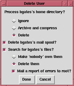 To remove a user, select a user in the main window by clicking on it, and then click on Remove. You will be presented with the dialog box presented in Figure 24. There are three types of action you may take. You may ignore the user's home directory, leaving it alone, you can archive and compress it into a .tar.gz file, or you can delete it completely. You can delete the user's mail spool if you like. These first two actions will take place immediately after you confirm the deletion, before the tool accepts more input. You can search for files owned by the user on parts of the filesystem other than the user's home directory and either give ownership to the user nobody or delete them. If you choose to search for the user's files, you have the option of mailing a report of the errors to root. This is important because the searching will be done in the background as you continue to work; it may take a long time. To find files owned by nobody, execute the following command: