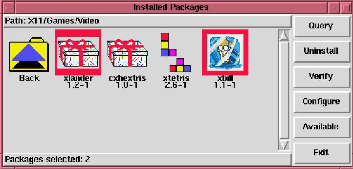 To see what packages are available for you to install, choose the Available pushbutton from any glint window. After a few moments, a new window, like the one shown in figure 44, will appear. The differences in the title and buttons indicate that this window is listing packages you may install. Navigating through these packages and selecting them is the same as in the other glint windows.