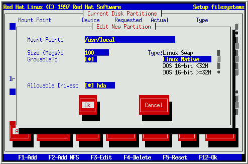 To Add a new partition, select the Add button, and press [Space] or [Enter]. A dialog box entitled ``Edit New Partition'' will appear (see Figure 18). It contains the following fields:
