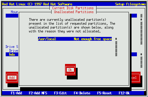 If your attempt to add a partition and Disk Druid can't carry out your request, you'll see a dialog box like the one in figure 19. In the box are listed any partitions that are currently unallocated, along with the reason they could not be allocated. Select the Ok button, and press [Space] to continue. Note that the unallocated partition(s) are also displayed on Disk Druid's main screen (though you may have to scroll the ``Current Disk Partitions'' section to see them).