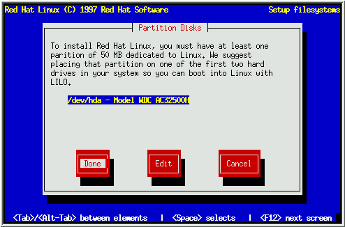 If you'd rather use fdisk to manage partitions, this is the section for you. Once you've selected fdisk, you'll be presented with a dialog box entitled ``Partition Disk'' (see Figure 22). In this box is a list of every disk on your computer. Move the highlight to the disk you'd like to partition, select Edit, and press [Space]. You will then enter fdisk and can partition the disk you selected. Repeat this process for each disk you want to partition. When you're done, select ``Done''.