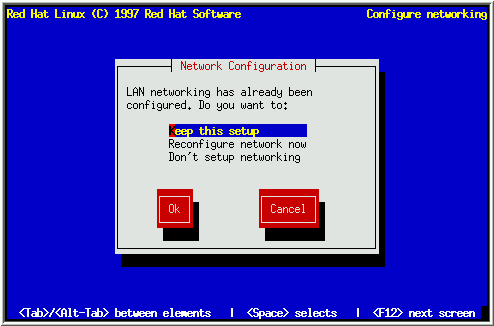 If you are installing Red Hat Linux via NFS or FTP, you have already entered temporary networking information. The install program offers you three choices (see Figure 32):