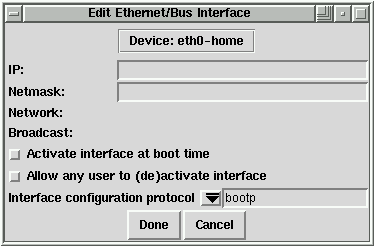 In the past, this situation would have required a fair bit of effort to accommodate. With clone interfaces, it's only necessary to create two clones of the original Ethernet interface, and give them the appropriate information. This is done by selecting the interface to clone and pressing the clone button. After giving the clone device a name (such as ``home''), you'll see a window similar to the one in Figure 4.