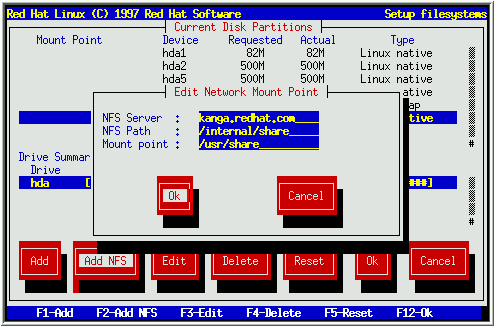 Additionally, Red Hat Linux allows you to mount read-only NFS volumes when your system boots; this allows directory trees to be shared across a network. Choose Add NFS. If you have not selected a network-related installation method, you will be presented with several dialog boxes concerning network configuration (Turn back to Section 3.4.6 for more information). Fill them in appropriately. You will then see a dialog box entitled ``Edit Network Mount Point''. Enter the NFS server's hostname, the path to the NFS volume, and the local mount point for that volume (see Figure 26).