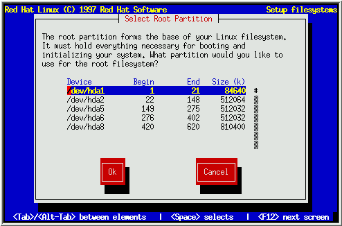 If you are performing a full install, the installation program presents a list of the Linux partitions it can find and prompts you to choose a root partition (see Figure 24. The root partition (or root filesystem) is the one which holds everything necessary to boot your Red Hat Linux system; it is mounted on / (the root directory) when your system boots. Select the root partition you wish to use and press [Enter].