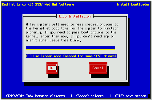 Finally, the installation program will ask if you wish to add default options to the LILO boot command (see Figure 45). Any options you enter will be passed to the Linux kernel every time it boots. If you have an LBA drive, check Use linear mode. Select OK and press [Space] when finished.