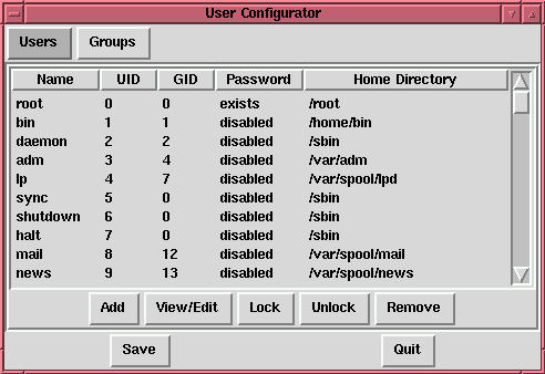 Sometimes you may just want to temporarily remove a user, with the intention of reinstating the user later. The Lock and Unlock functions handle this. When you deactivate a user, the user's password is locked by prepending a `*' to it, preventing the user from logging in. You also have the option of ``collapsing'' the user's home directory with tar and gzip, which can save some space. When you reactivate a user, the password locking is removed, and if the home directory was collapsed, it is expanded back to normal. When you lock a user, you are presented with the same options as when you delete a user, but you are unlikely to want to delete any files.