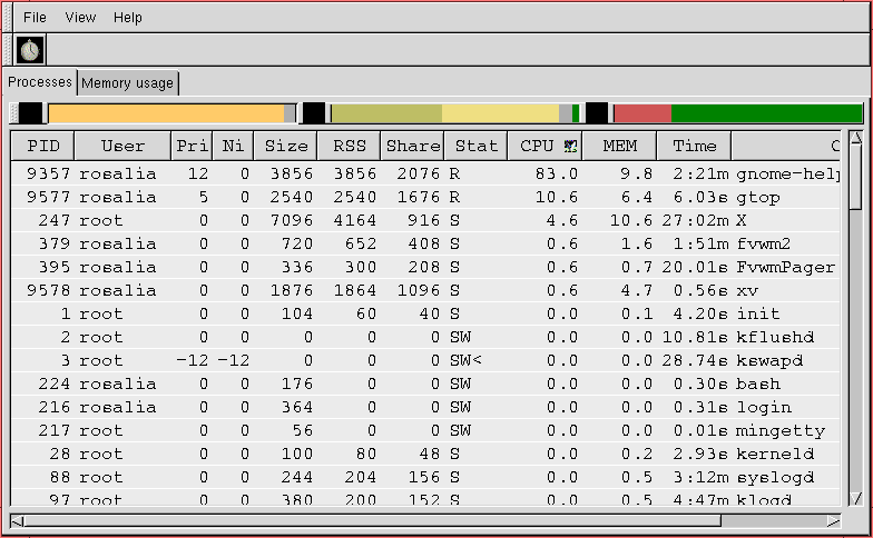 In Figure 2-20 you can see one of the memory views in gtop: this tells you what the resident size of each process is. Other views (which can be selected with the Memory menu) show you the processes' total memory and shared library memory.