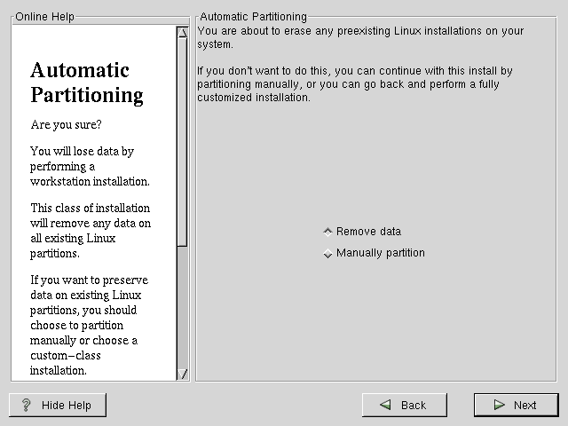 A server-class installation will remove data on all partitions of all hard drives. If you have another OS on your system that you wish to keep installed, if you do not want Red Hat Linux to be installed on your master boot record (MBR), or if you want to use a boot manager other than LILO, do not choose this installation method.
