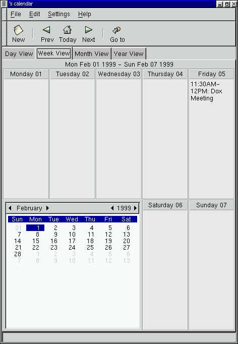 Using the GNOME Calendar is quite simple and most tasks can be performed from any of the major views, Day, Week, Month or Year. Probably one of the most important features to remember is that at any time you can right mouse click on a particular day and add a new appointment. There are many other features which will be described below in each of the major views.