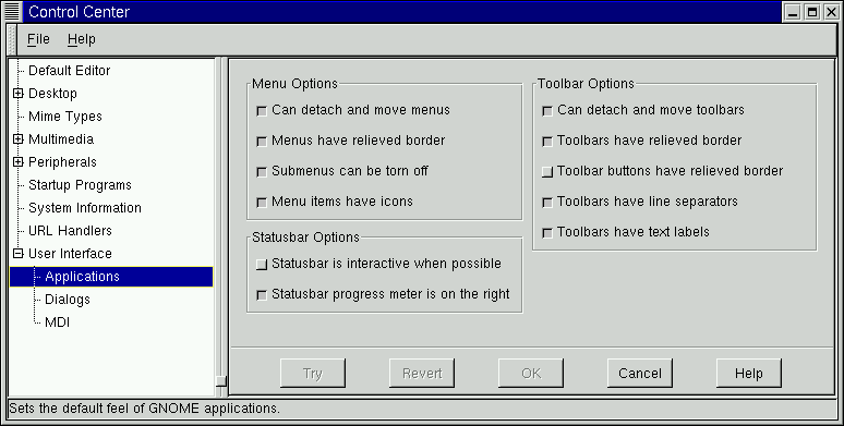 The Application Defaults capplet allow you to change certain user interface aspects of your GNOME compliant applications.