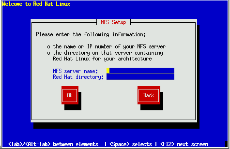 Enter the name (which must be a fully-qualified domain name) or IP address of your NFS server, and the name of the exported directory that contains the Red Hat Linux installation files or CD. For example, if you're installing from a host named eastcoast in the domain redhat.com, enter eastcoast.redhat.com in the NFS Server field.