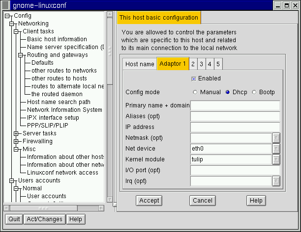 • Open Config => Networking => Client tasks => Basic host information. The Host name tab will request a host name, which should be specified by default unless you did not setup your networking during the installation process. If it is not already specified, please take the time now to configure it. It should be specified as localhost.localdomain. Skip this tab. Select the tab for Adaptor 1.