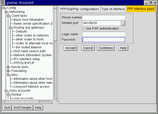 • Information about whether your ISP uses an authentication method such as PAP, CHAP or MS-CHAP. If so, you will need a "secret" to enable authentication. The secret will be a word or sequence of characters. CHAP and MS-CHAP are not currently supported using linuxconf, and are rarely used.