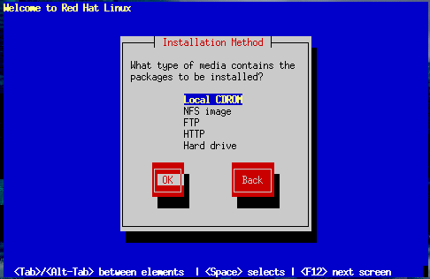 If you booted from the diskette in your boxed set and are installing with the Red Hat Linux CD-ROM in a local drive. If you choose this method, you'll next see the Welcome dialog: turn to the section called Welcome.