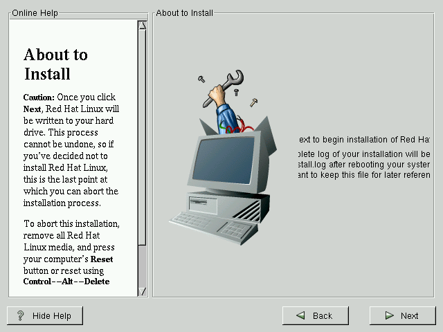 If, for some reason, you would rather not continue with the installation process, this is your last opportunity to safely cancel the process and reboot your machine. Once you press the Next button, partitions will be written and packages will be installed. If you wish to abort the installation, you should reboot now before your hard drive(s) are rewritten.