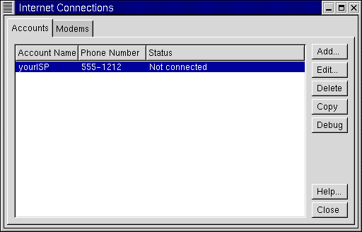 In the Internet Connections dialog which appears, you can add a new account, delete an account and modify current account configuration. You can also debug the account, meaning that you can test your settings to see if there are any problems.