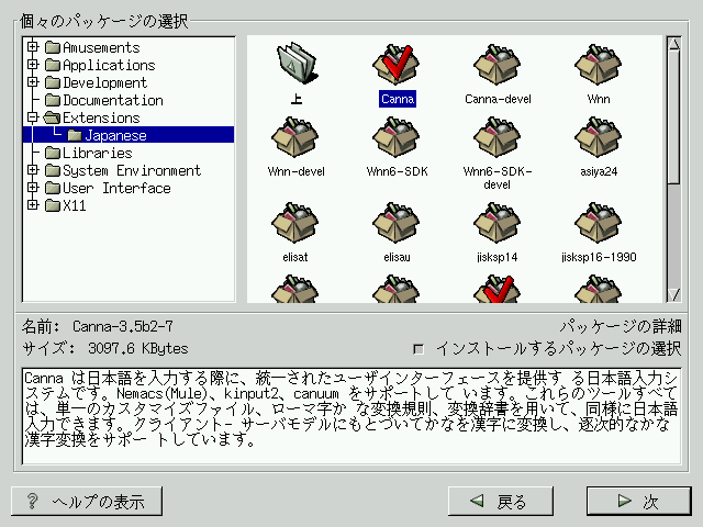 インストールするコンポーネントを選択した後で、個々のパッケージの選択/選択解除を行うことができます。インストールプログラムによって、グループに含まれるパッケージの一覧が表示されるので、マウスで選択/選択解除することができます (「図 3-15」を参照)。