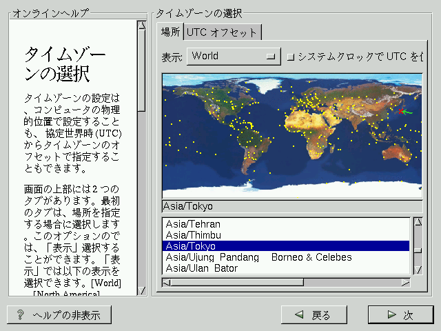 タイムゾーンの設定は、コンピュータの物理的位置で設定することも、 協定世界時 (UTC) からタイムゾーンのオフセットで指定することもできます。
