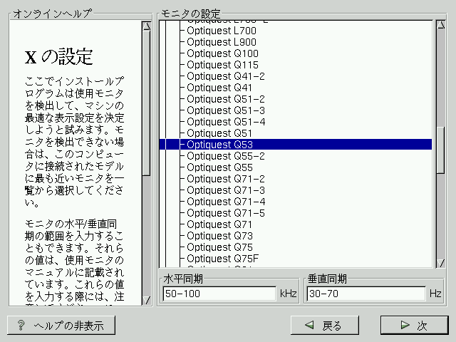 使用モニタが一覧内にない場合は、最も適した Generic モデルを選択してください。Generic モニタを選択した場合は、Xconfigurator によって水平同期と垂直同期の範囲が示されます。一般に、それらの値はモニタに付属するマニュアルに記載されています。またはモニタのベンダまたはメーカから入手することができます。これらの値が正しく設定されていることをマニュアルで確認してください。