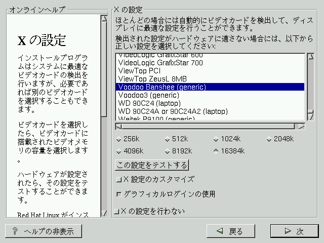 次に、Xconfigurator はビデオカードに搭載されたビデオメモリの量を入力するように指示します。分からない場合は、ビデオカードに付属のマニュアルを参照してください。実際よりも多いメモリを選択してもビデオカードを破損することはありませんが、XFree86 サーバが正しく機能されない可能性があります。