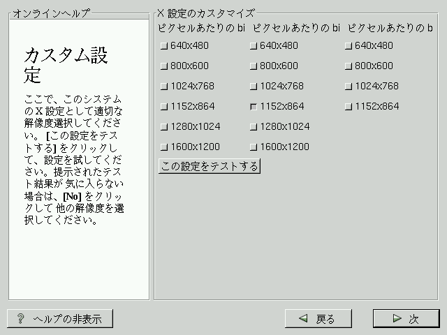 X の設定をカスタマイズしたい場合は、[X 設定のカスタマイズ] ボタンが選択されていることを確認してください。カスタマイズする場合は、別の画面が表示されるので、そこで解像度を選択します (「図 3-19」を参照してください)。ここでも再び、設定をテストするというオプションがあります。