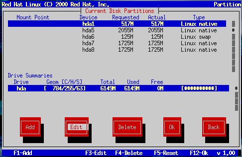 [OK] -- システムのパーティションに対する変更内容をディスクに書き込むことを確認します。Disk Druid がハードディスクのパーティションテーブル (群) を書き直す前に、本当に変更することの確認を求められます。さらに、定義済のすべてのマウントポイントがインストールプログラムに渡され、最終的に Red Hat Linux システムによってファイルシステムレイアウトを定義するために使用されます。
