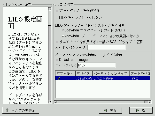 Red Hat Linux システムをブートできるようにするためには、通常は LILO (LInux LOader) をインストールする必要があります。以下のいずれかの場所に LILO をインストールすることができます。