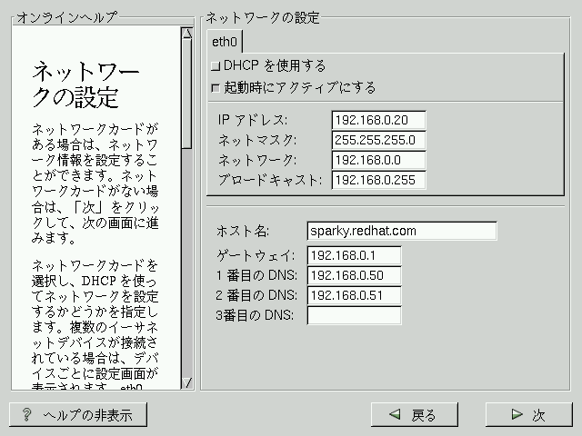 デバイスタイプを選択し、DHCP を使ってネットワークを設定するかどうかを指定します。複数のイーサネットカードがある場合、指定した情報は各デバイスごとに保存されます。eth0、eth1といったタブで、デバイス画面を切り換えることができます。指定した情報は、各画面ごとに設定されます。[ブート時にアクティブにする] を選択しておくと、ネットワークカードはブート時に起動されます。DHCP を使用しないかどうか不明な場合は、ネットワーク管理者にご確認ください。