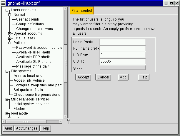 • Open Config => Users accounts => Normal => User accounts. Linuxconf may show you a filter screen (see Figure 3-2).