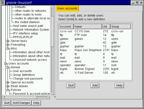 Linuxconf allows you to configure and control various aspects of your system, and is capable of handling a wide range of programs and tasks. Complete documentation of linuxconf could be a separate book in its own right and is certainly more than we can cover in this chapter. Instead, we'll focus on common tasks such as adding new users and getting connected to a network.