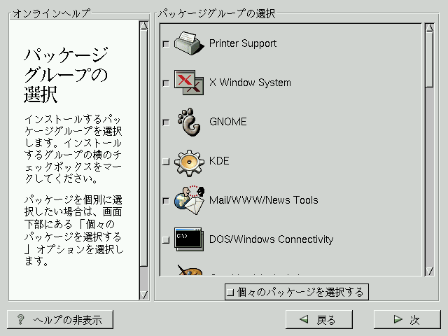 機能にしたがってパッケージをグループ化したコンポーネント (たとえば、 C Development、Networked Workstation、または Web Server)、個別のパッケージ、あるいはその組み合わせを選択することができます。
