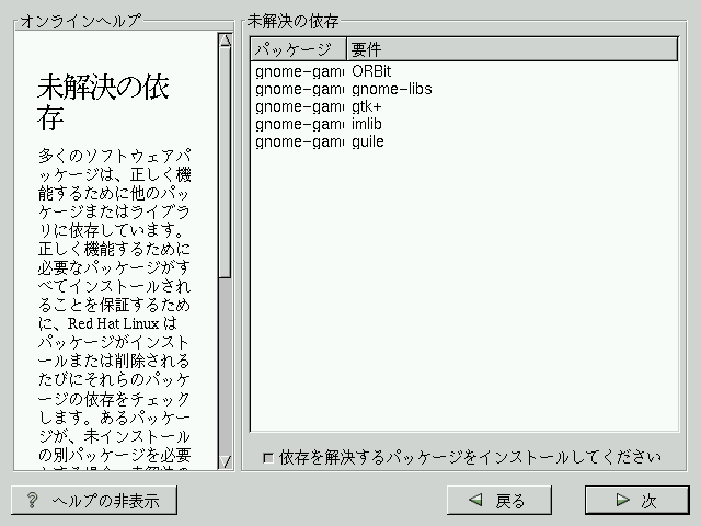 [解決されていない依存関係] 画面は、選択したパッケージに必要なパッケージが選択されていない場合にのみ表示されます。不足パッケージ一覧の下の画面下部に [依存関係を満たすようにパッケージをインストールする] チェックボックスがあり、デフォルトで選択された状態になっています。チェックしたままにしておくと、インストールプログラムは必要パッケージを選択パッケージの一覧に追加することによって、自動的にパッケージの依存関係を解決します。