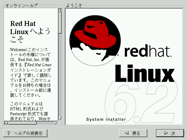 [Red Hat Linux へようこそ] の画面 (図 2-4を参照) では、インストールについての指示は表示されません。どこでオフィシャル Red Hat Linux 製品を登録するかについての追加の説明や情報については、左側のパネルの中のヘルプテキストを参照してください。