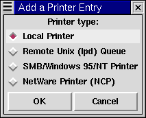 SMB/Windows 95/NT Printer: Ein Drucker, der an einen Computer angeschlossen ist, auf dem Windows oder Samba ausgeführt wird. (Bei Samba handelt es sich um eine Reihe von Programmen, mit denen Windows-Rechner mit UNIX- und Linux-Rechnern in einem Netzwerk Dateien und Dienste gemeinsam nutzen können.)