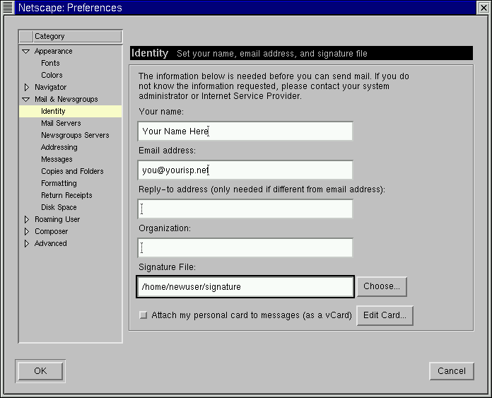 Um Nachrichten lesen und senden zu können, müssen Sie Ihre persönlichen Einstellungen in der Kategorie Mail & Newsgroups von Communicator (Edit=>Preferences) eingeben. Außerdem können Sie in dieser Kategorie noch alle weiteren Einstellungen für E-Mails und Newsgroups festlegen.