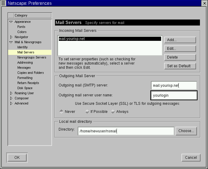 Sie können den Speicherort für Ihre Mails entweder festlegen, indem Sie ein Verzeichnis im Feld Local mail directory angeben oder auf den Button Choose klicken und dann ein Verzeichnis im angezeigten Navigationsdialogfeld auswählen. Standardmäßig werden Ihre E-Mails in einem Unterverzeichnis Ihres Heimatverzeichnisses gespeichert. Wenn Ihr Name beispielsweise neuerbenutzer lautet, handelt es sich bei diesem Verzeichnis um /home/newuser/nsmail.