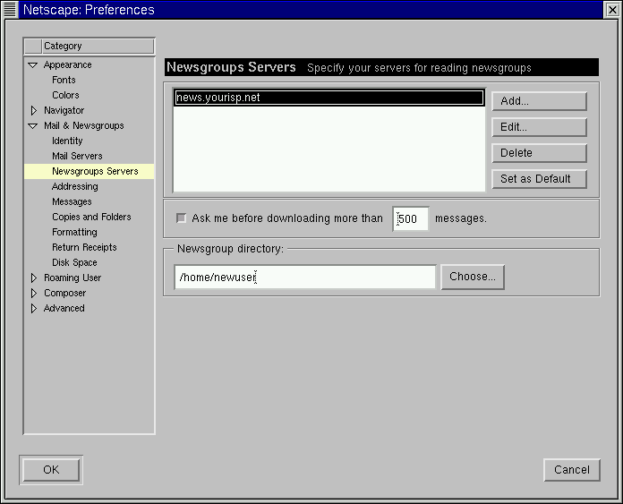 Geben Sie in der Kategorie Newsgroup Servers den Namen des Servers ein, der für das Abrufen und Bereitstellen von Beiträgen für Newsgroups verwendet werden soll (siehe Abbildung 7-10).