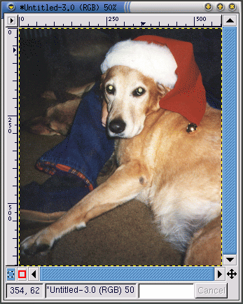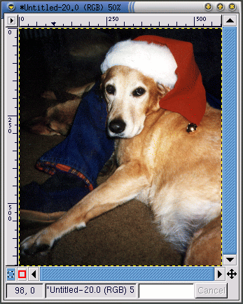 Erstellen Sie ein neues Bild, das größer ist als die Fotografie von Bonnie und einen weißen Hintergrund hat. Schneiden Sie das Bild von Bonnie aus, und fügen Sie es in das größere, weiße Bild ein. Erstellen Sie mit dem rechteckigen Auswahltool eine rechteckige Auswahl, die nur geringfügig kleiner ist als das Bild von Bonnie. Klicken Sie anschließend mit der rechten Maustaste auf das Bild, und wählen Sie Select => Invert, um die Auswahl zu invertieren. Es ist jetzt ein rechteckiger "Rahmen" um das Bild ausgewählt, siehe Abbildung 9-13.