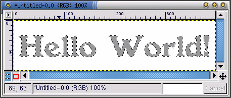 Jetzt ist der "richtige" Text hinzuzufügen. Zuerst muss die aktive Vordergrundfarbe geändert werden. Hier wurde ein blasses Rot (RGB 204 051 051) gewählt. Klicken Sie dann bei aktivem Texttool auf das Bild. Das Dialogfeld Texttool wird geöffnet. Überprüfen Sie, ob dieselben Einstellungen gewählt wurden (standardmäßig vorhanden, es sei denn, GIMP wurde geschlossen). Klicken Sie auf OK, um dem Bild den roten Text "Hello World!" hinzuzufügen, und verschieben Sie den Text in die richtige Position, siehe Abbildung 9-28.