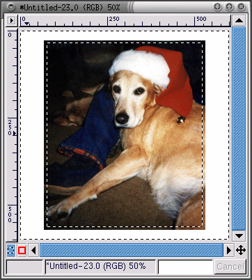 Create a new image, larger than Bonnie's photograph, with a white background. Cut and paste the Bonnie image into the larger, white image. Use the rectangular select tool to select a rectangle just slightly smaller than Bonnie's image. Then right-click on the image, and choose Select => Invert to invert the selection, so a rectangular "frame" around the image, is selected, as in Figure 9-13.
