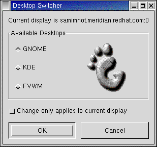 Puede cambiar de entornos gracias a las utilidades Switchdesk (veaFigura 2-11). Si está usando GNOME, KDE o AnotherLevel, puede seleccionar el nuevo entorno en Switchdesk y salir. Cuando reinicie la sesión, le aparecerá el nuevo entorno.