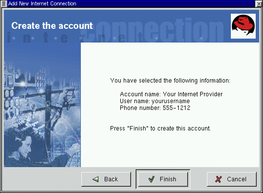 Si vous êtes satisfait des entrées, cliquez sur Finish pour créer le compte ; si vous voulez modifier les informations, cliquez sur le bouton Back pour revenir à l'écran précédent.