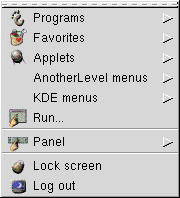 A partir d'ici, vous pouvez démarrer l'ensemble des applications et applets inclus pour GNOME ; vous pouvez également accéder à des applications KDE, sous les menus KDE, et à des applications que vous trouveriez dans le gestionnaire de fenêtres AnotherLevel (pour autant qu'elles aient été installées en premier lieu).