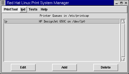 Quando l'utility viene avviata, vedrete una finestra simile alla Figura 5-2. All'inizio, non troverete stampanti elencate, perchè non avete ancora aggiunto una stampante a /etc/printcap.